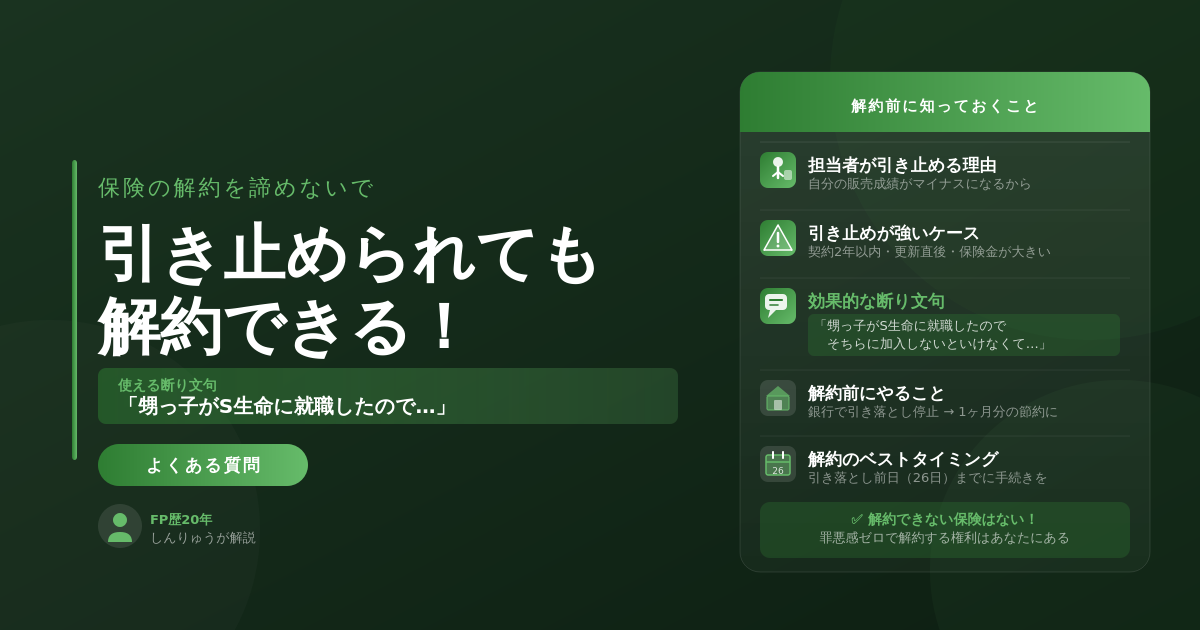 この記事では、担当者に引き止められてもスムーズに解約の意思を伝えられる具体的な断り文句を、FP歴20年のしんりゅうが解説します。