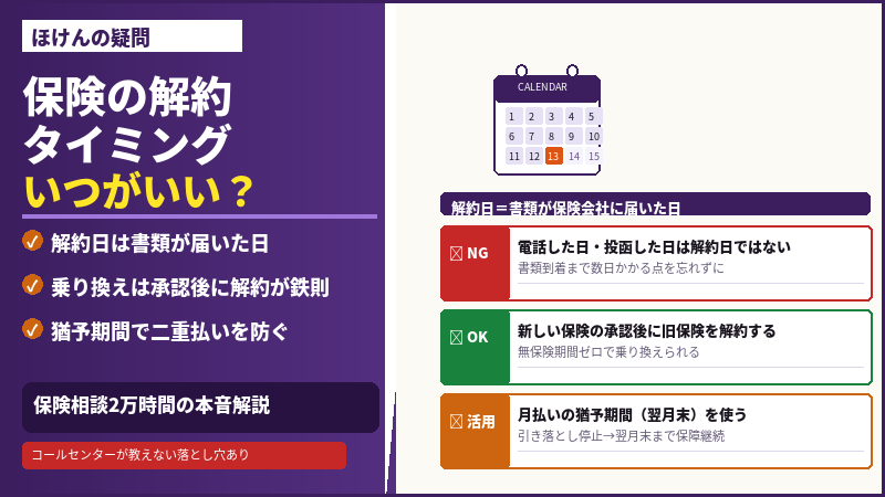保険の解約は、タイミングを間違えると保険料が余計にかかったり、無保険期間が生じて万一の備えがゼロになったりします。保険会社やコールセンターが自分から教えてくれないポイントが複数あります。