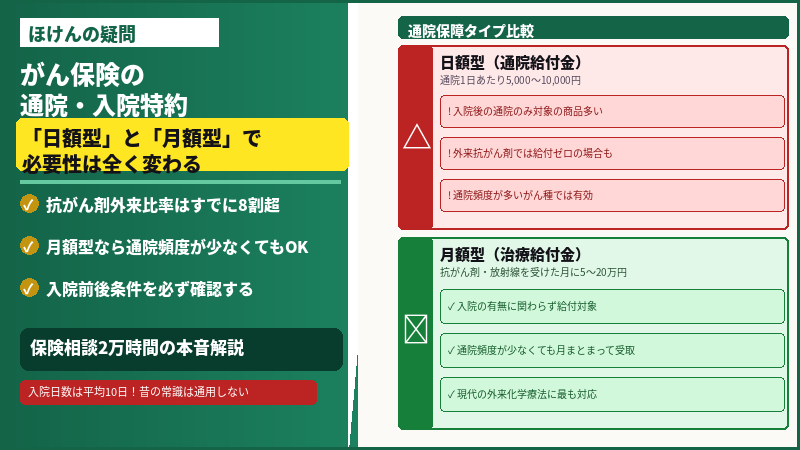 - 「通院給付金(日額型)」と「治療給付金(月額型)」の根本的な違い