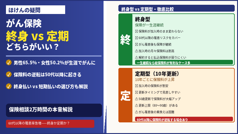 「がん保険は終身型と定期型、どちらを選べばいい?」「保険料はどれくらい違う?」「老後まで保障が必要なの?」——がん保険で最初に突き当たる選択が、この保障期間の問題です。