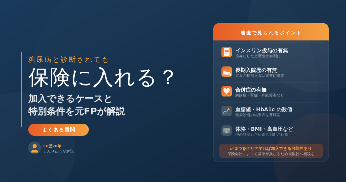 ただし、審査でどう判断されるかは状態によって大きく変わります。この記事では、FP歴20年のしんりゅうが「加入できるケース」「審査で見られるポイント」「特別条件の内容」をわかりやすく解説します。