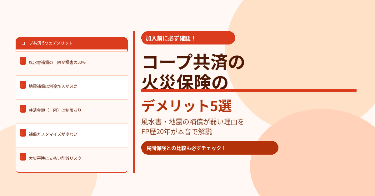この記事では、保険相談2万時間のしんりゅうが、コープ共済の火災保険のデメリット・注意点を具体的に解説します。