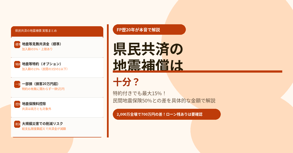 この記事では、保険相談2万時間のしんりゅうが県民共済の地震補償の実態を、民間地震保険と具体的な数字で比較しながら解説します。