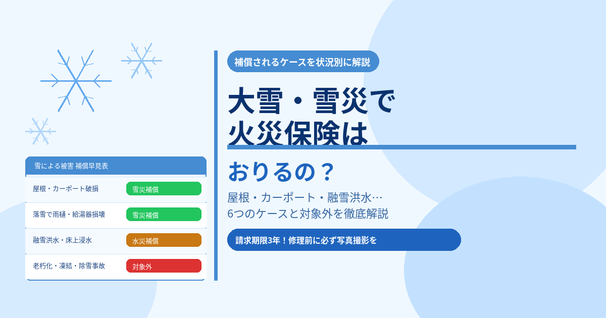 この記事では、保険相談2万時間のしんりゅうが、雪災補償の範囲・対象外ケース・免責金額の仕組み・請求手順を具体的に解説します。