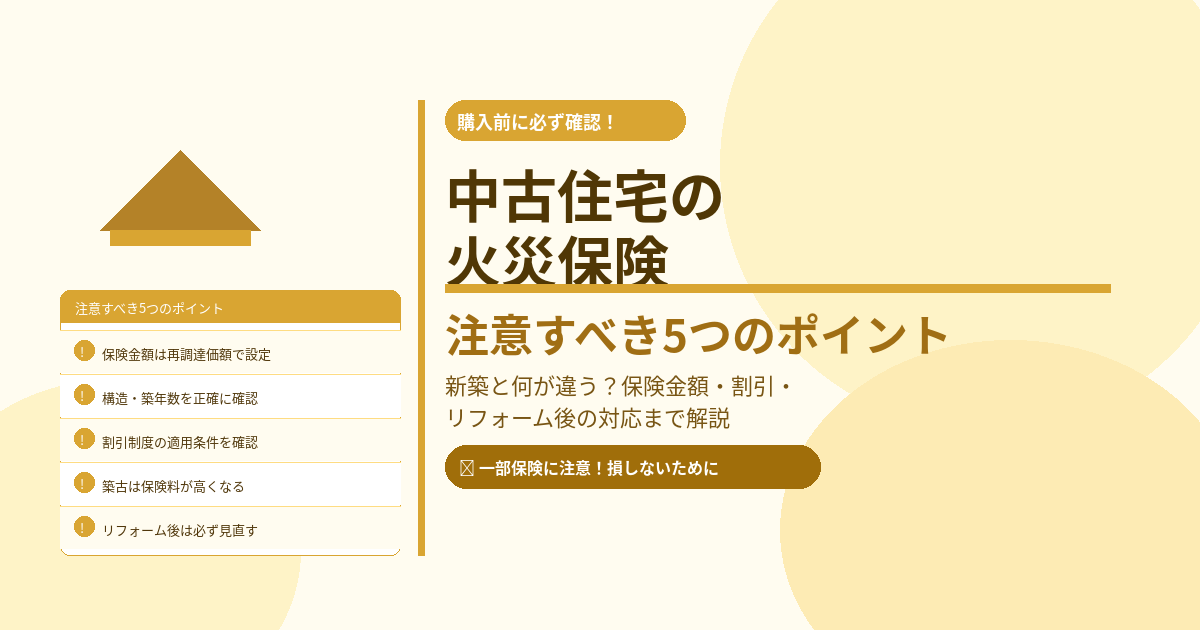 中古住宅の火災保険は、新築と比べていくつか注意すべきポイントがあります。特に保険金額の設定・構造の確認・割引の適用条件は、中古ならではの落とし穴になりやすい部分です。
