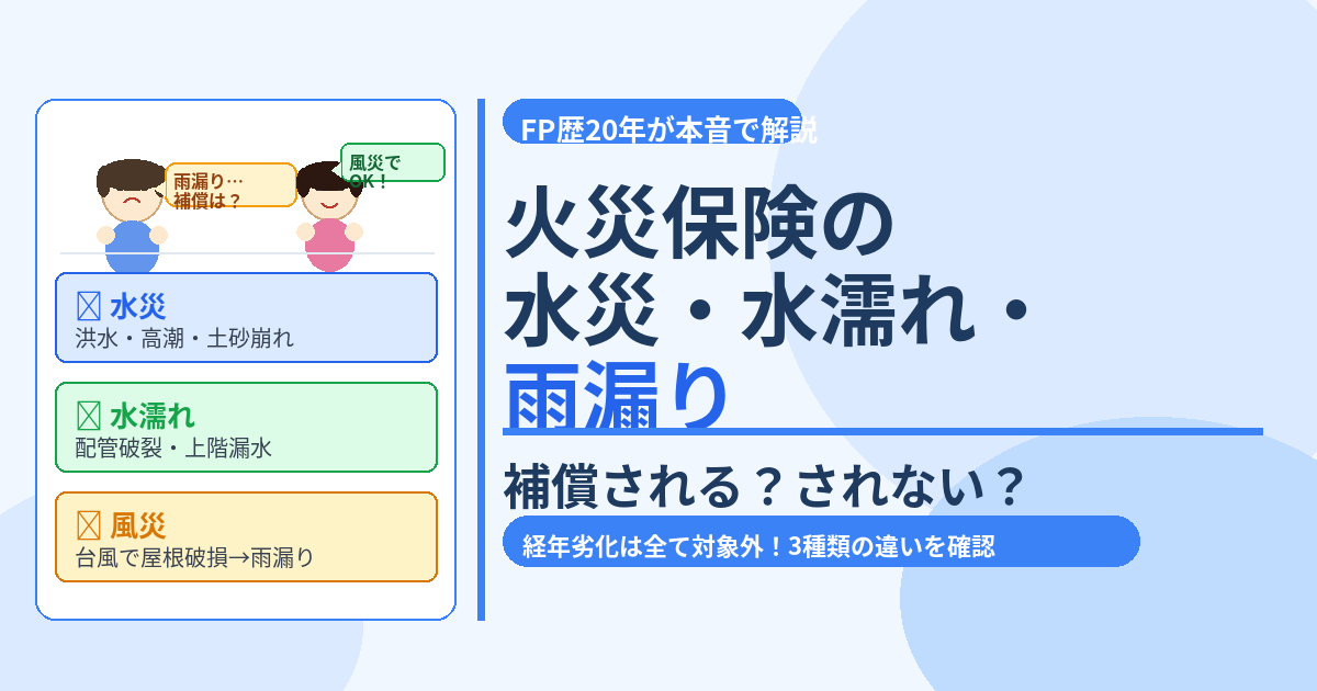 この記事では、保険相談2万時間のしんりゅうが、水に関する火災保険の補償を3種類に整理し、支払いを受けられる具体的な条件と金額を解説します。
