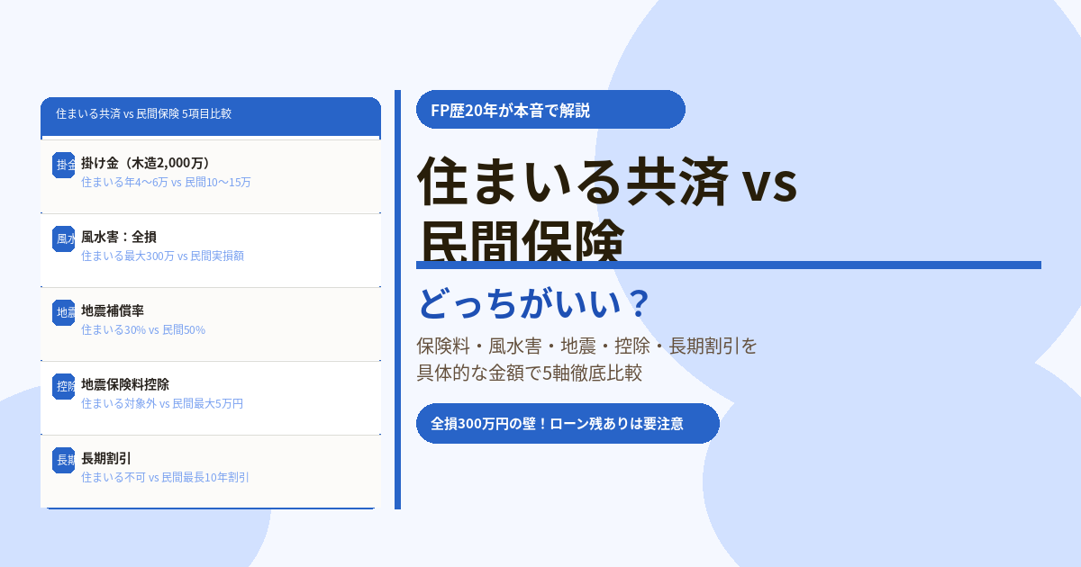 この記事では、保険相談2万時間のしんりゅうが住まいる共済と民間火災保険を5つの軸で具体的な数字を使って比較します。