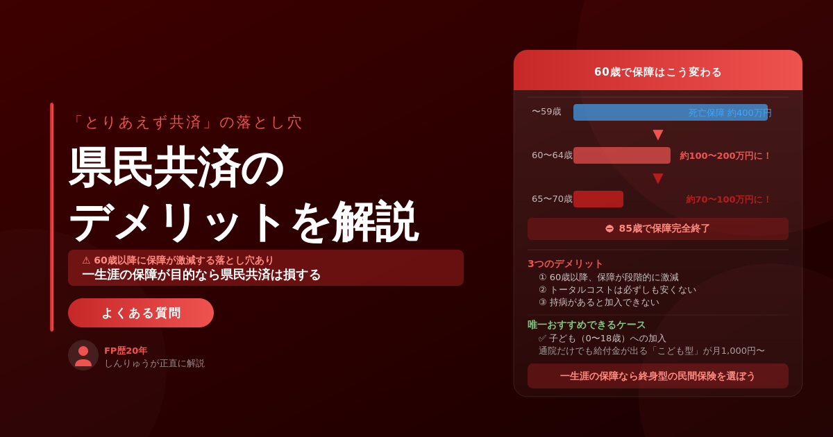 この記事では、FP歴20年のしんりゅうが県民共済のメリット・デメリットを正直に解説します。「県民共済だけで一生大丈夫?」と気になっている方はぜひ読んでみてください。