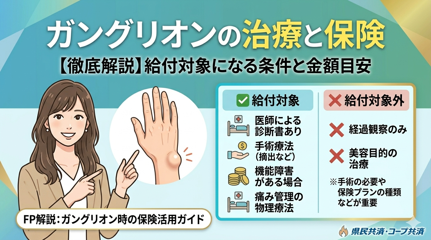 ガングリオンの治療に関する保険の適用範囲や給付内容については、具体的な保険契約の内容やコープ共済の案内資料、保険会社への問い合わせによって詳細を確認する必要があります。