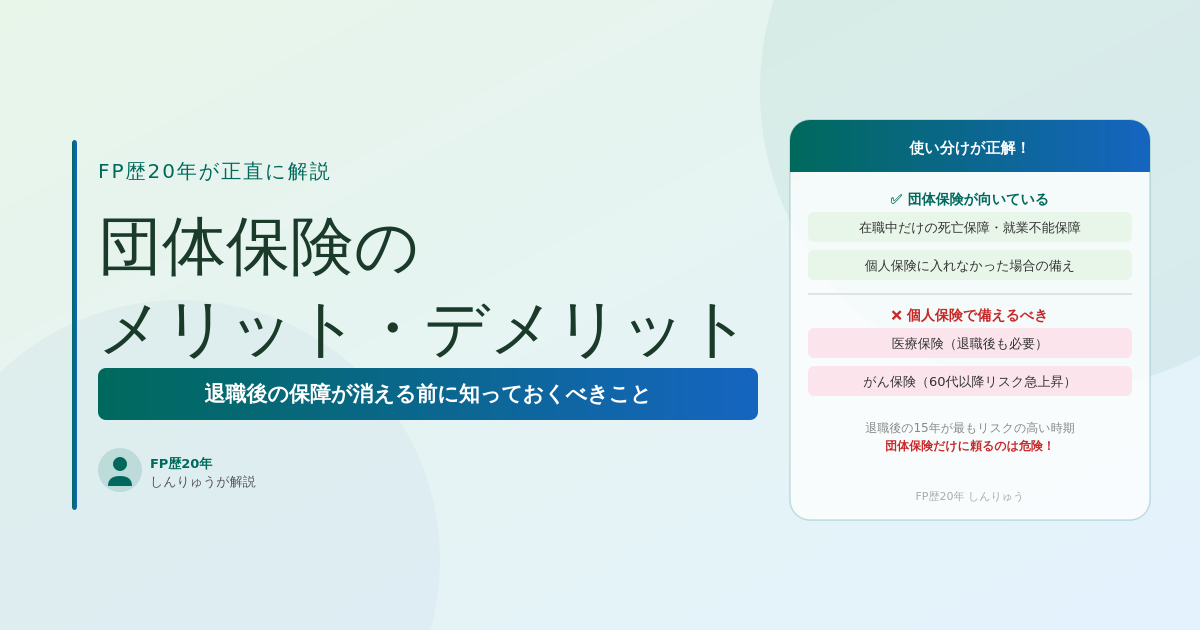 この記事では、FP歴20年のしんりゅうが団体保険のメリット・デメリット・正しい使い分け方を解説します。