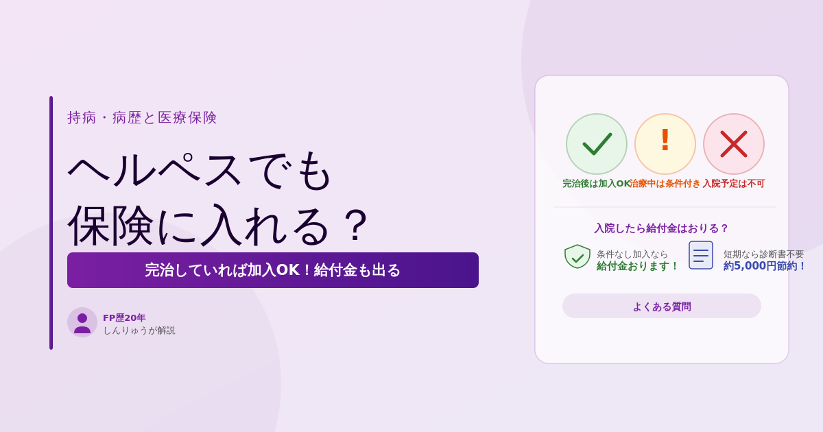 💡 しんりゅうのアドバイス:ヘルペス症状があっても、完治してから保険に加入するのがベストです。入院歴がなく完治していれば、条件なしで加入できる可能性が高くなります。