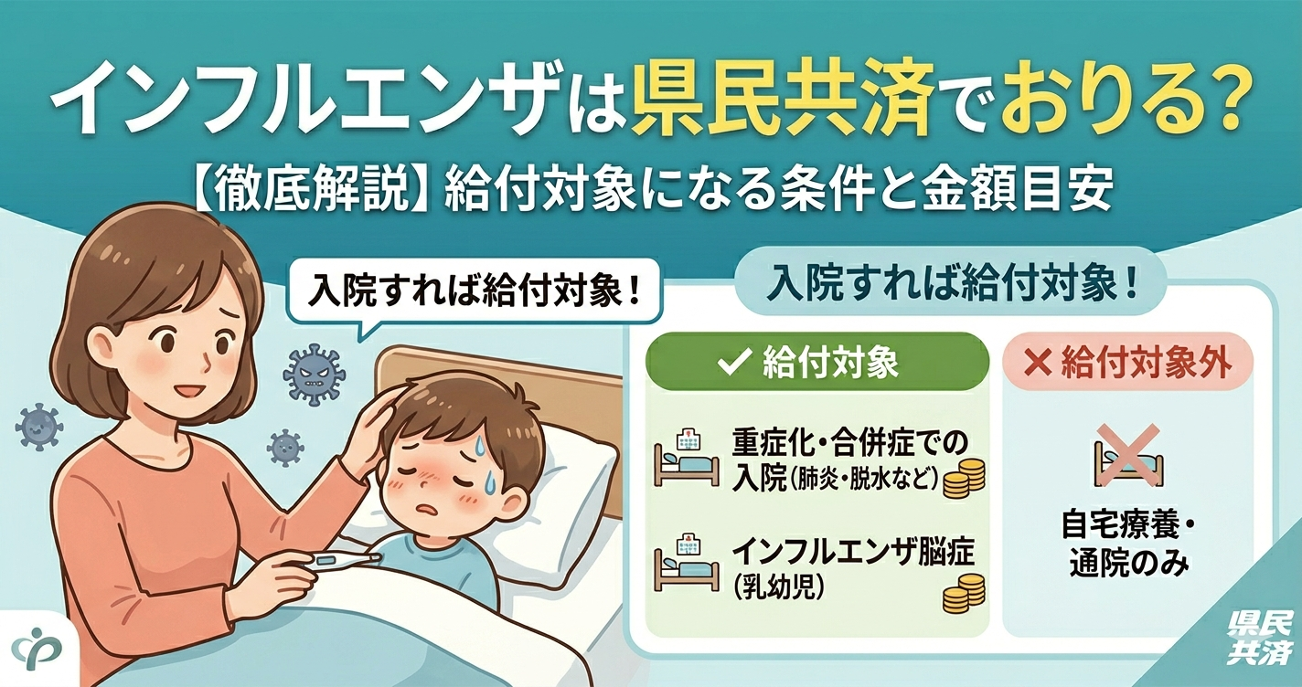 インフルエンザは毎年多くの人が感染する身近な感染症です。多くは自宅療養で回復しますが、重症化・合併症で入院が必要になるケースもあります。県民共済から給付金がもらえるのかどうか、わかりやすく解説します。