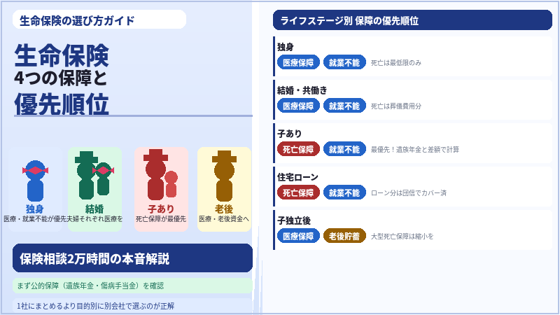 - 独身の場合:死亡保険より医療・就業不能が優先の理由