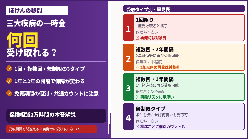 三大疾病保険の一時金を何回受け取れるかは、大きく3タイプに分かれます。まず全体像を把握しましょう。