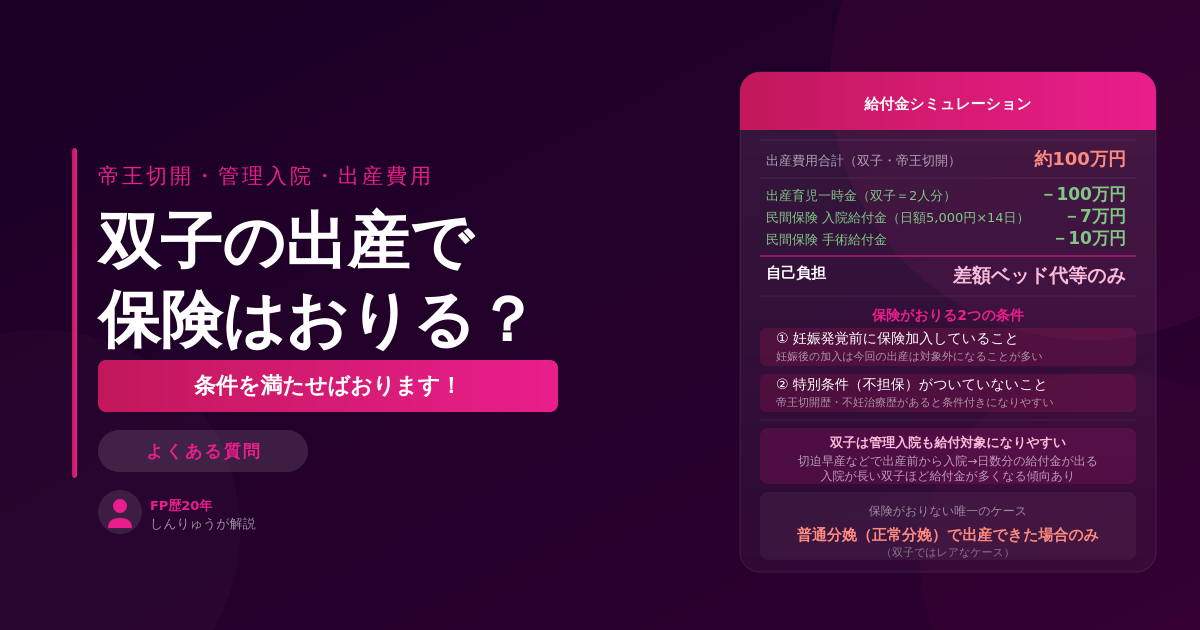 この記事では、FP歴20年のしんりゅうが、双子の出産にかかる費用の目安・保険がおりる条件・おりないケース・給付金の計算例まで、具体的に解説します。